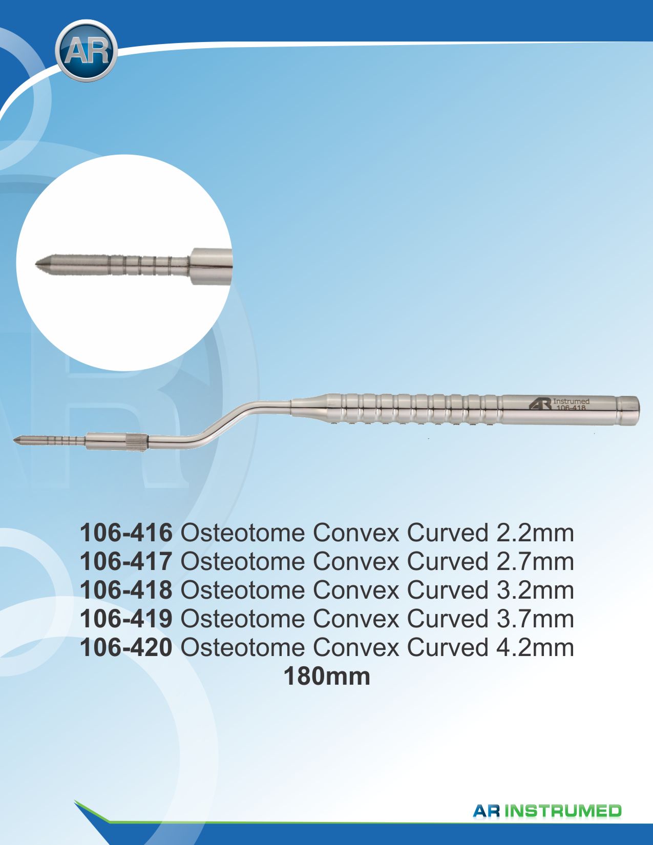 Osteotom mit Stopp, gebogen-Konvex-spitz (2.2 mm) Länge 180 mm Material: Hochwertiger medizinischer Edelstahl, korrosionsbeständig Autoklavierbar, sterilisierbar