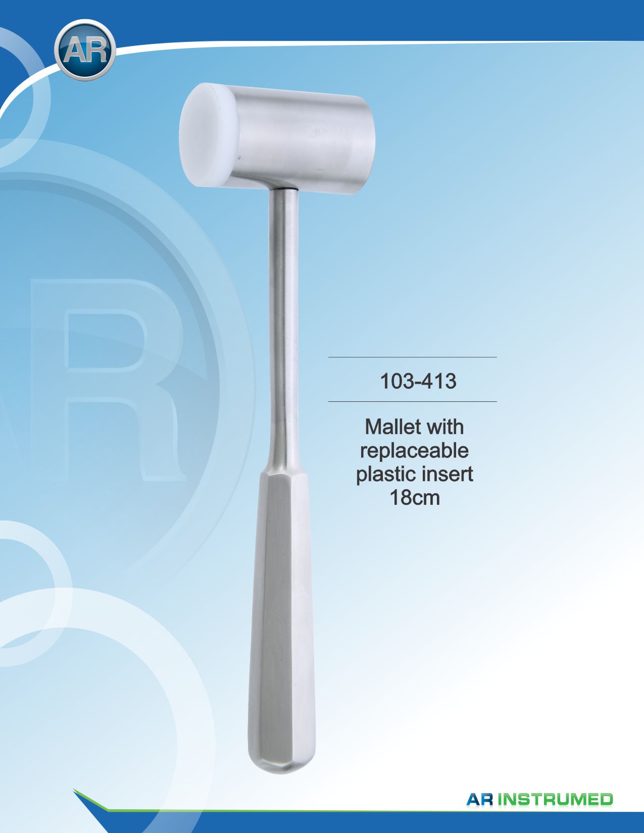 Marteau avec pièce en plastique remplaçable. Longueur : 18 cm. Matériau : Acier inoxydable médical de haute qualité, résistant à la corrosion. Autoclavable, stérilisable.