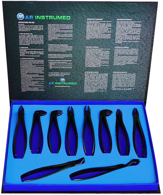 Extraction forceps set of 10 pieces, special handle, black plasma. Fig. 1: Upper incisors, Fig. 7: Upper premolars, Fig. 13: Lower premolars, Fig. 17: Left upper molars, Fig. 18: Right upper molars, Fig. 22: Lower molars, Fig. 33A: Lower roots, Fig. 51: Upper roots, Fig. 67: Upper third molars, Fig. 79A: Lower third molars