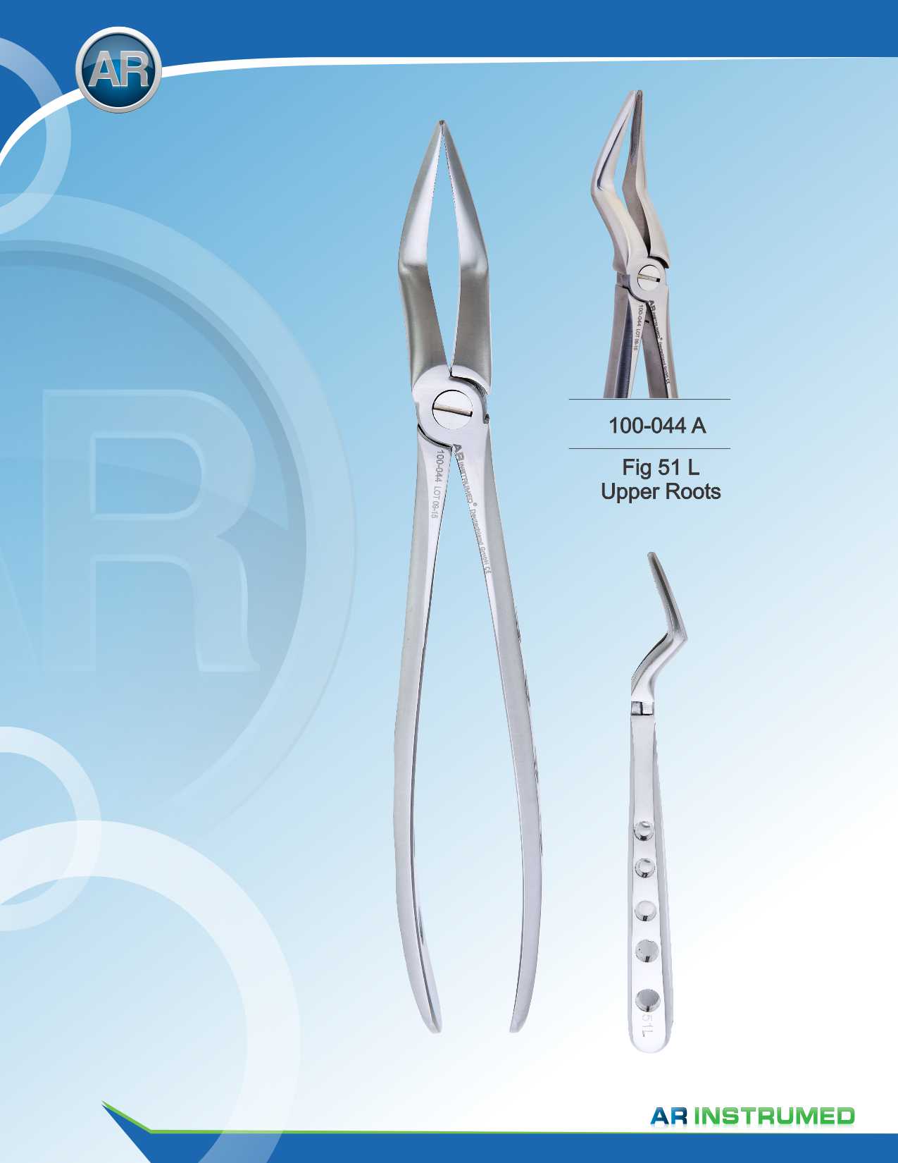 -Extractor forceps upper root, figure 51L -Material: High-quality, corrosion-resistant medical stainless steel -Cut-off profile (cross serration) -Force jaws with longitudinal and transverse serrations inside -Serrated edge for better friction on the toot
