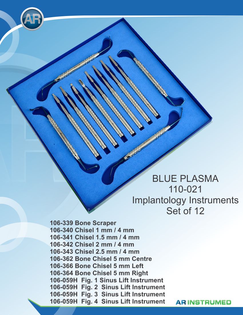 Implantology set of 12 pieces 106-339-1 Bone scraper 106-340 Chisel 1mm/4mm 106-341 Chisel 1.5mm/4mm 106-342 Chisel 2mm/4mm 106-343 Chisel 2.5mm/4mm 106-362 Chisel 5mm middle 106-363 Chisel 5mm left 106-364 Chisel 5mm right 106-059-1H Sinus-Lift Instrument Premium Grade Figure 1 106-059-2H Sinus-Lift Instrument Premium Grade Figure 2 106-059-3H Sinus-Lift Instrument Premium Grade Figure 3 106-059-4H Sinus-Lift Instrument Premium Grade Figure 4