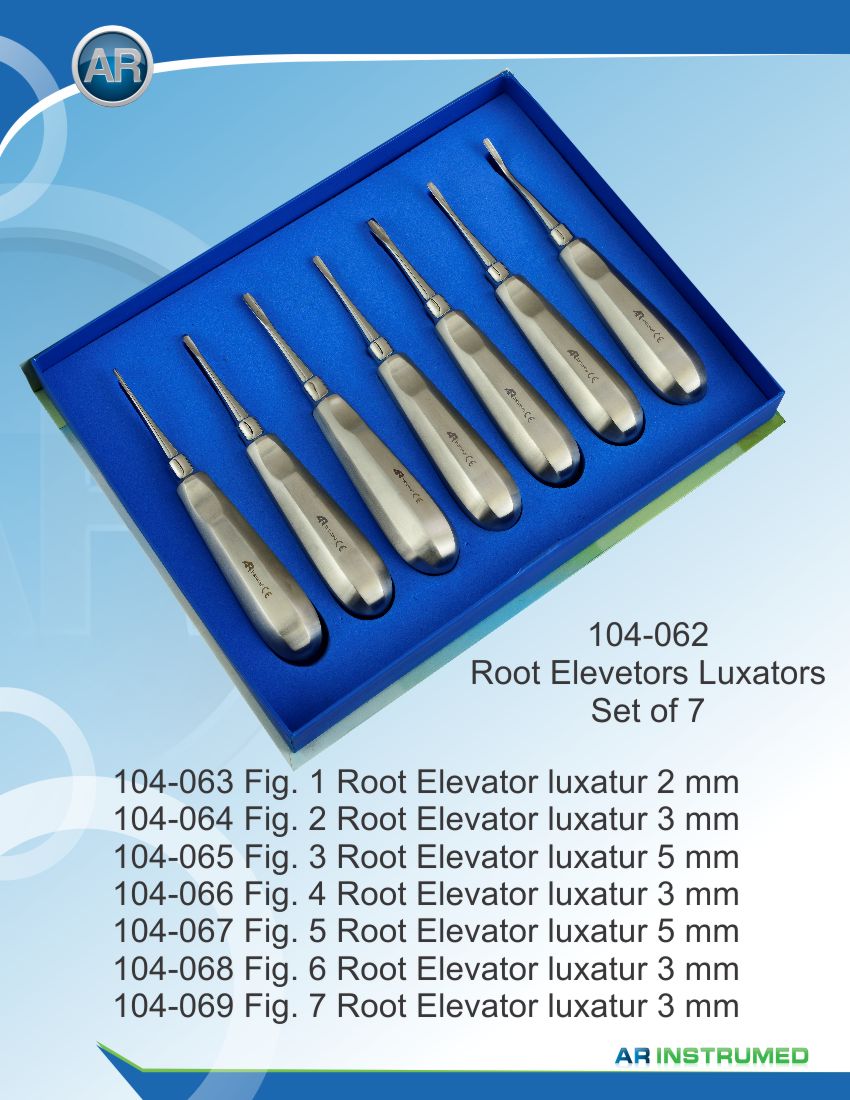 Root Elevator Luxations Set of 7 Fig.1 Luxator 2mm Fig.2 Luxator 3mm Fig.3 Luxator 5mm Fig.4 Luxator 3mm Fig.5 Luxator 5mm Fig.6 Luxator 3mm Fig.7 Luxator 3mm